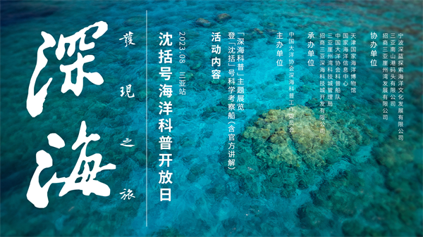 本次开放日由中国大洋协会指导,中国大洋协会深??破展ぷ魑被嶂靼?,国家海洋博物馆、国家海洋信息中心、中国大洋协会科普船队、三亚崖州湾科技城管理局、招商三亚深海科技城开发有限公司承办,宁波深蓝探索海洋文化发展有限公司、三亚南山港码头有限公司、招商三亚崖州湾发展有限公司协办。